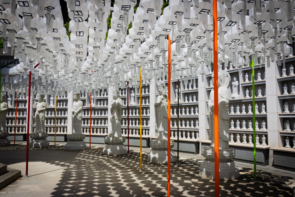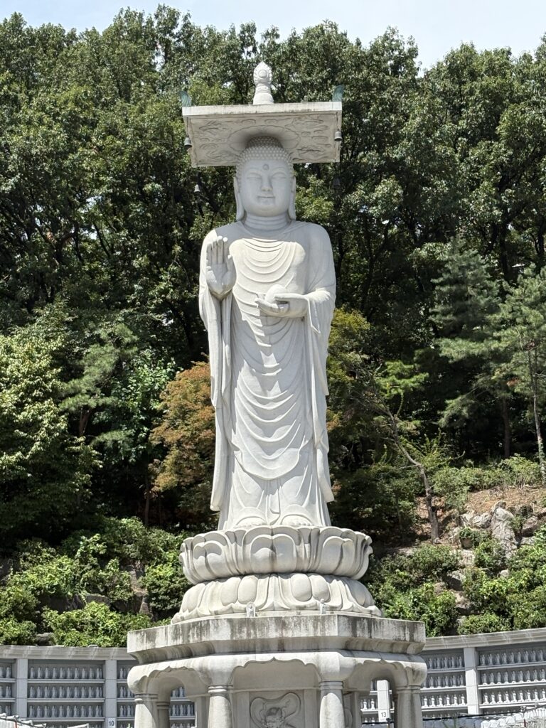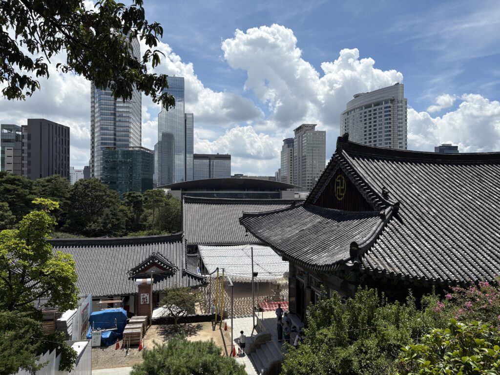 Visite du plus grand temple (bouddhiste)Bongeunsa de Séoul et son Bouddha géant. Le contraste entre les pavillons du temple et les bâtiments modernes aux alentours est saisissant.