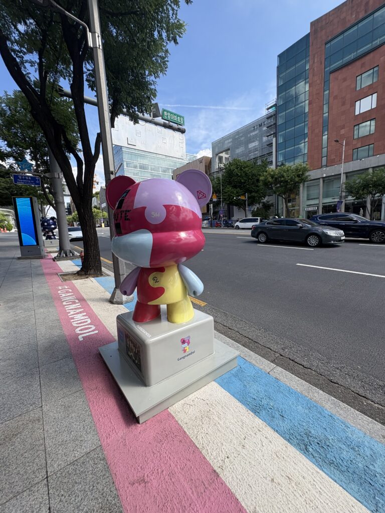 Pas très loin, Apgujeong-dong est un quartier tendance avec de nombreuses et immenses boutiques de luxes. C’est ici que l’on trouve la K-star road, une rue de 1 km qui abrite des statues en forme d’ours et aux couleurs des groupes de K-pop.